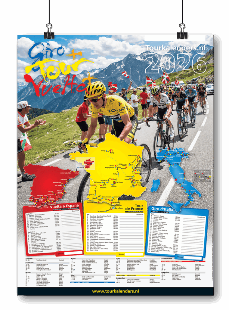 Ontdek de opwindende wereld van wielerrondes met onze geweldige Tourkalenders! Jij kunt nu zelf het dagelijkse etappeschema van de drie grootste wielerrondes volgen. Hang de agenda met etappes van de Giro, Tour de France en Vuelta als een poster aan jouw muur.